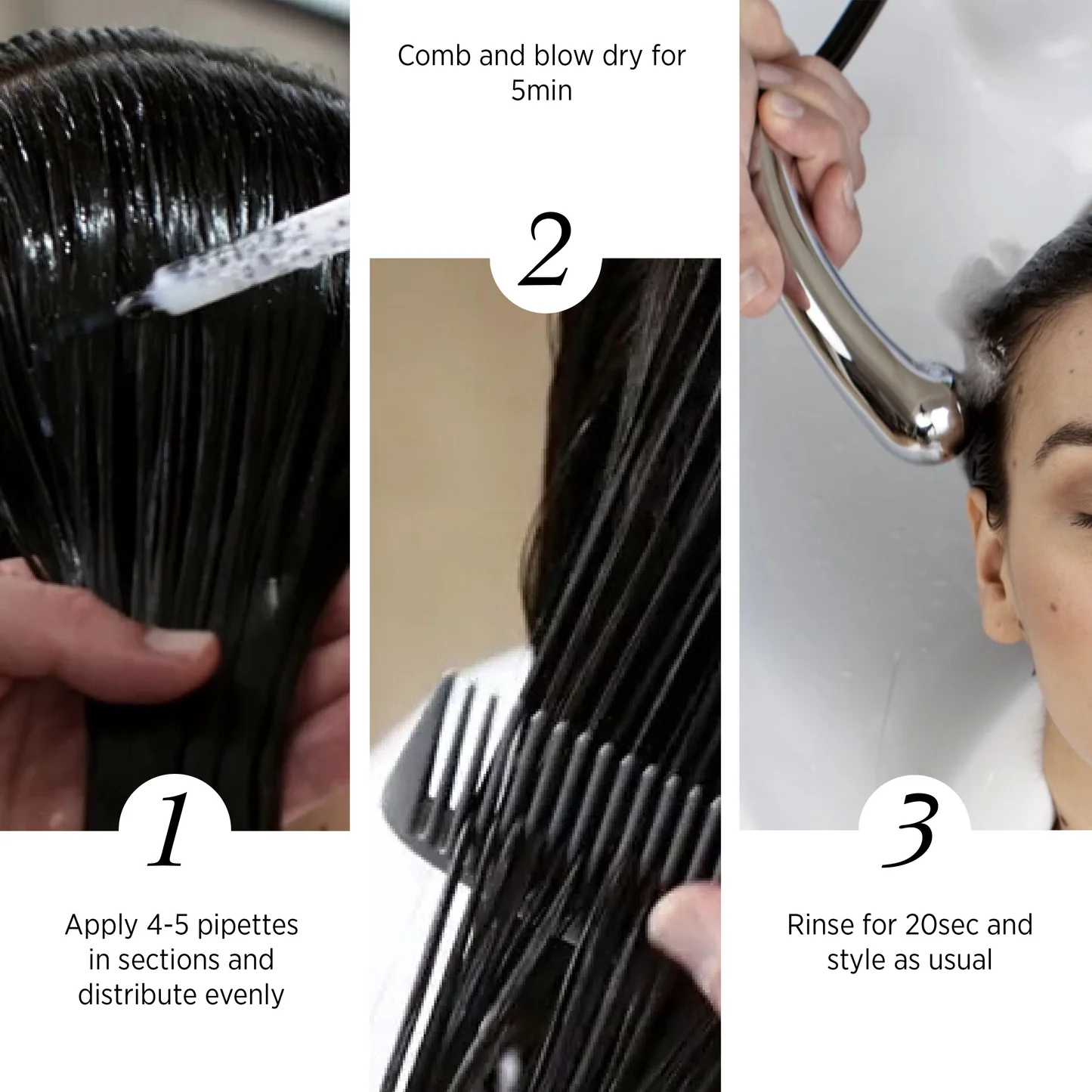 Tratamentul Liquid Hair se aplică de obicei în salon, după spălare, pe părul umed, secțiune cu secțiune. Formula se activează cu ajutorul căldurii – de regulă, prin uscător – ceea ce permite ingredientelor active să se fixeze în structura internă a firului.