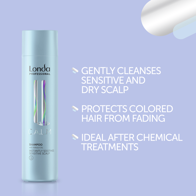 Samponul Londa Professional C.A.L.M curata delicat scapul uscat si sensibil, oferind o senzatie de calmare si de confort. De asemenea, ajuta la mentinerea culorii parului vopsit si este ideal a se folosi dupa tratamentele chimice. Formula sa contine ingrediente speciale, precum uleiul de marula, cunoscut pentru proprietatile sale regenerante. Acesta calmeaza inflamatia scalpului si reduce roseata pielii, oferind imediat o senzatie de confort.