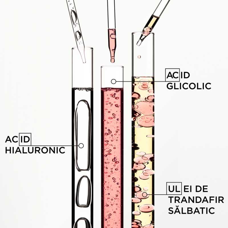 Acid hialuronic Folosit foarte mult in produsele de skincare, acidul hialuronic se gaseste in mod natural in organism si absoarbe o cantitate mare de apa, oferind o hidratare de lunga durata. Acidul glicolic este un acid natural din fructe, folosit in cosmetica datorita proprietatilor sale de exfoliere. Acesta patrunde in profunzimea pielii, fiind recunoscut astfel ca un ingredient foarte puternic si eficient. Ulei de trandafir salbatic Ingredientul preferat. Aduce experienta senzoriala si feminitate dedicata fetelor Gen Z.