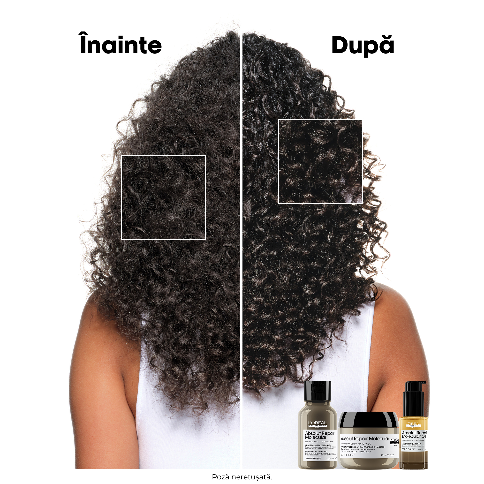 Uleiul bifazic Absolut Repair Molecular, repara 2 ani de par deteriorat* si reumple structura macromoleculara a firului de par. *, asigurand pana la 100 de ore de stralucire* si pana la 3 zile de efect anti-frizz, fara sa incarce parul.