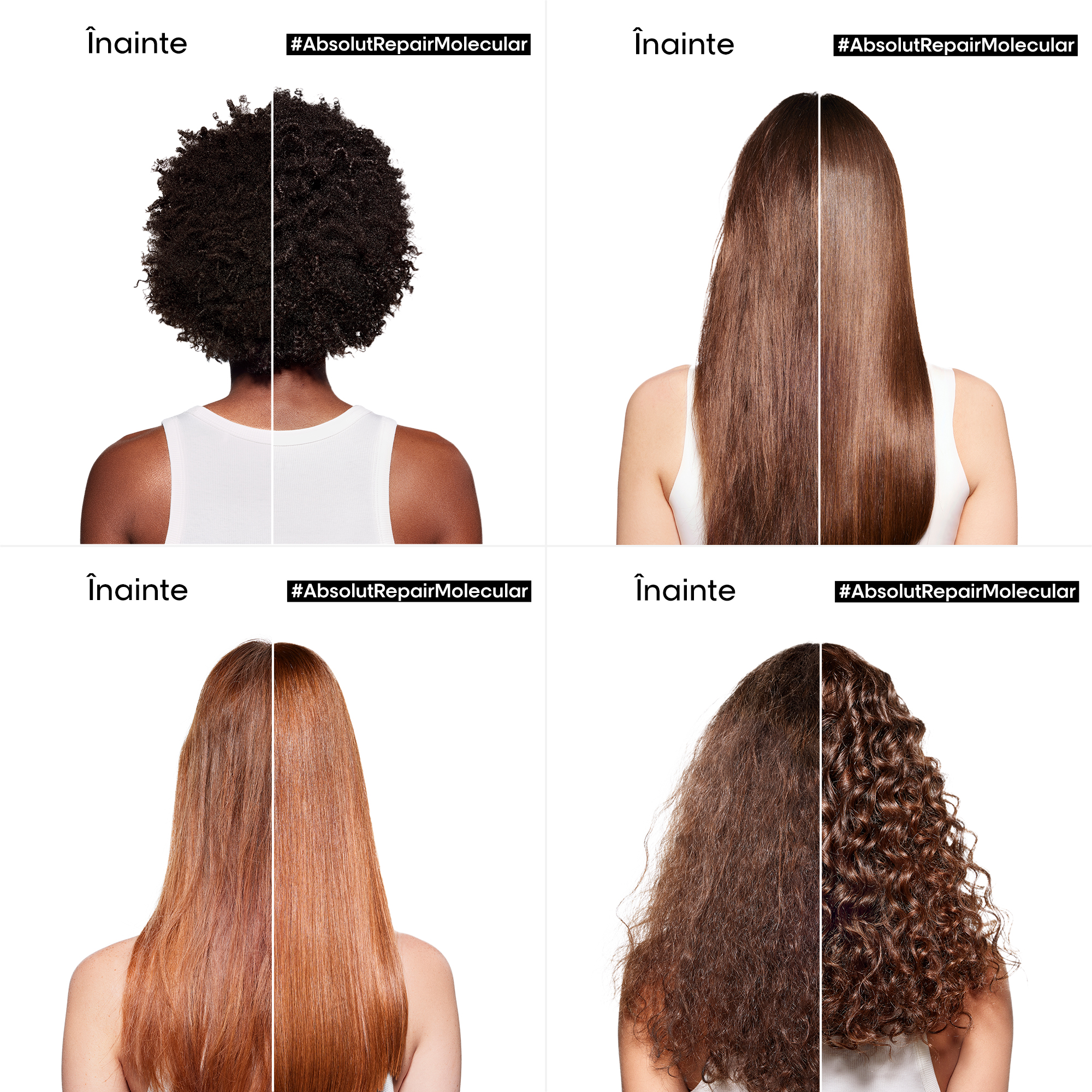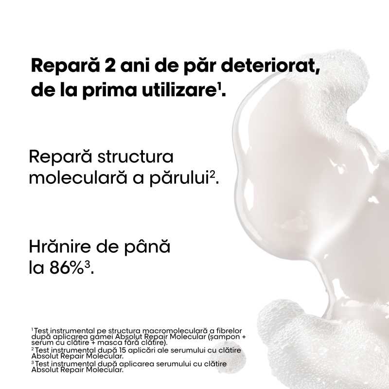 • Ofera un nivel ridicat de ingrijire. Parul este mai rezistent si hranit, cu elasticitate & miscare naturala imbunatatita**. * Test instrumental după 15 aplicări ale gamei Absolut Repair Molecular (șampon + serum cu clătire + crema leave-in fară clătire). ** Test pe consumatori timp de 2 săptamâni de utilizare a gamei Absolut Repair Molecular (șampon + serum cu clătire + crema leave-in fară clătire).