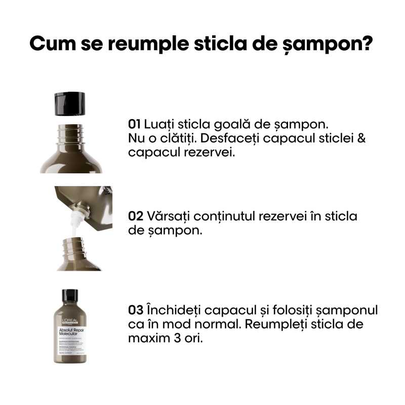 Cum se aplica samponul? Aplicati samponul profesional Absolut Repair Molecular pe parul umed. Emulsionati pana cand se obtine o spuma bogata. Clatiti. Urmati cu serumul cu clatire Absolut Repair Molecular + masca concentratata si crema leave in fara clatire Absolut Repair Molecular. In caz de contact cu ochii, clatiti imediat cu apa din abundenta. Cum se reumple sticla de sampon? 1 Luati sticla goala de sampon. Nu o clatiti, Desfaceti capacul sticlei & capacul rezervei. 2 Varsati continutul rezervei in sticla de sampon 3 Inchideti capacul si folositi samponul ca in mod normal. Reumpleti sticla de maxim 3 ori.