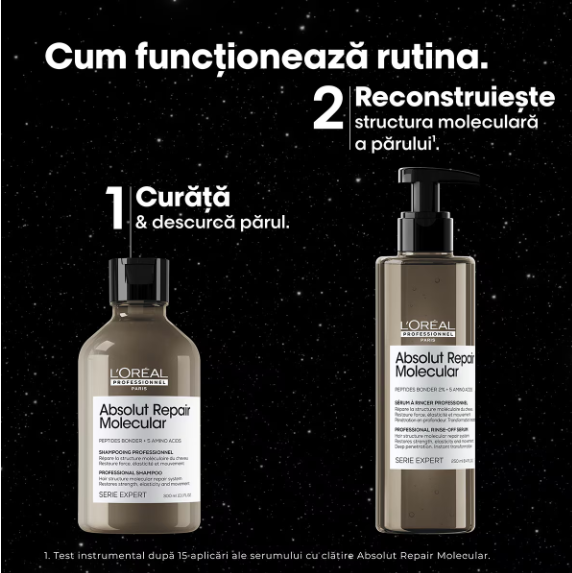 Set rutina profesionala L’Oreal Professionnel Serie Expert Absolut Repair Molecular DUO pentru par deteriorat, formulat cu legaturi peptidice si 5 aminoacizi, repara structura macro-moleculara a parului, Sampon 300ml + Serum 250ml