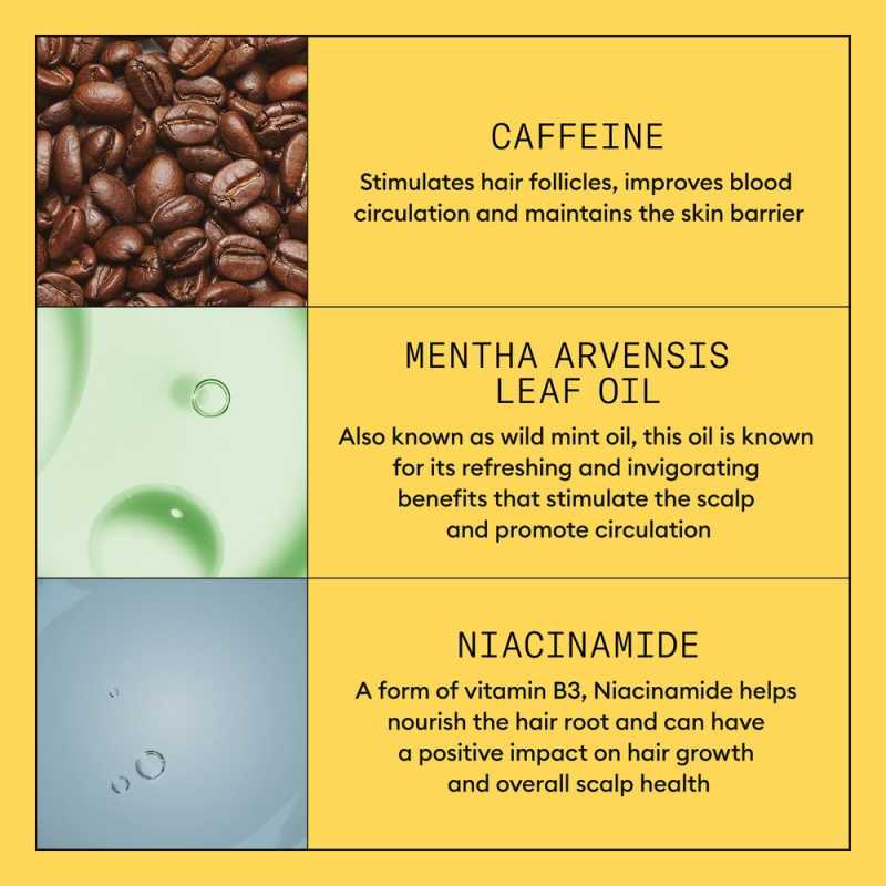 ATENTIE: A se evita contactul cu ochii. A nu se lasa la indemana copiilor. Pentru orice intrebari sau preocupari legate de efectele secundare, consultati intotdeauna un medic specialist.Aqua/Water/Eau, Niacinamide, Caffeine, Phenoxyethanol, Sodium Benzoate, Benzyl Alcohol, Acrylates/C10-30 Alkyl Acrylate Crosspolymer, Polysorbate 80, Polysorbate 60, Acetamide MEA, Triethanolamine, PEG-23M, Propylene Glycol, Tetrasodium EDTA, Methyl Nicotinate, Parfum/Fragrance, Mentha Arvensis Leaf Oil, Mentha Piperita (Peppermint) Oil, PEG-30 Dipolyhydroxystearate, Trideceth-6, Limonene, Camellia Sinensis Leaf Extract, Silica, Cystine Bis-PG-Propyl Silanetriol, Biotin, Lecithin, Tocopheryl Acetate, Humulus Lupulus (Hops) Flower Extract, Citrus Paradisi (Grapefruit) Peel Extract, Urtica Dioica (Nettle) Leaf Extract, Acer Saccharum (Sugar Maple) Extract, Citrus Limon (Lemon) Peel Extract, Saccharum Officinarum/Sugar Cane Extract/Extrait de canne à sucre, Vaccinium Myrtillus Leaf Extract, Faex Extract/Yeast Extract/Extrait de levure, Propylparaben, Citrus Aurantium Dulcis (Orange) Fruit Extract, BHT, Potassium Sorbate, Maltodextrin, Methylparaben, Ethylparaben, Butylparaben.