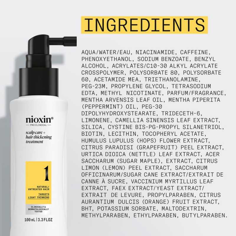 Nioxin System 1 este conceput pentru un par natural, netratat chimic, cu aspect usor subtiat. De asemenea, protejeaza parul impotriva caderii si ruperii, contribuind la intarirea si ingrosarea firului de par. Rutina in trei pasi incepe cu samponul, continua cu balsamul de par si cu tratamentul fara clatire pentru par System 1.