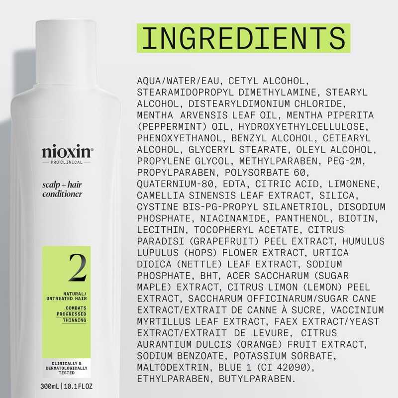Formulat cu un amestec puternic de niacinamida, biotina si cofeina, acest balsam anticadere pentru un par natural vizibil subtiat contribuie la hranirea radacinii parului, stimularea foliculilor de par si intarirea acestuia. Balsamul de par Nioxin System 2 imbunatateste sanatatea scalpului prin promovarea unui mediu sanatos pentru cresterea parului. Formula sa usoara si hidratanta contine ingrediente care intaresc firul de par, luptand impotriva deteriorarii si ruperii.