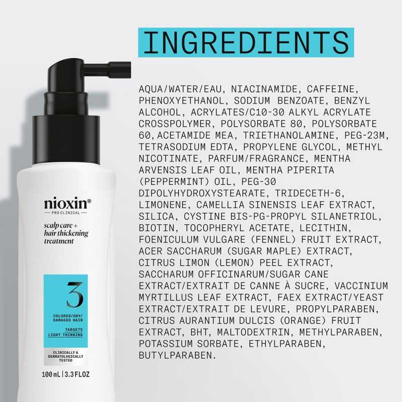 Mod de utilizare: Aplica tratamentul Nioxin System 3 Scalp + Hair Thickening pe parul uscat cu prosopul, insistand pe scalp si pe zonele de interes. Maseaza usor pentru a distribui uniform produsul pe par. Nu se clateste. Coafeaza parul dupa preferinte. Pentru rezultate optime, foloseste-l impreuna cu samponul si balsamul Nioxin System 3 Scalp + Hair.