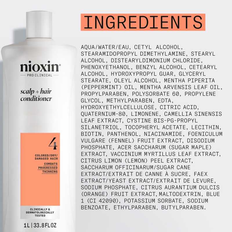 Nioxin System 4 este conceput pentru un par vopsit sau deteriorat, afectat de subtiere avansata. De asemenea, protejeaza parul impotriva caderii si ruperii, contribuind la intarirea si ingrosarea firului de par si la mentinerea unei culori vibrante. Rutina in trei pasi incepe cu samponul, continua cu balsamul de par si cu tratamentul fara clatire pentru par System 4.